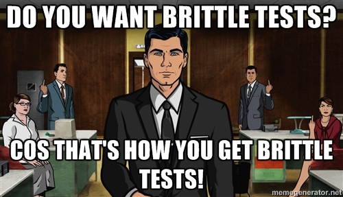 Add another section to the output? Your tests are broken. Comments? Your tests are broken. Extra newlines? Your tests are broken. In none of these scenarios is the code buggy, and yet, in all of them N tests have to be modified even though the behaviour is the same. In one case I had passing unit tests checking for code generation when the output wouldn’t even compile!
